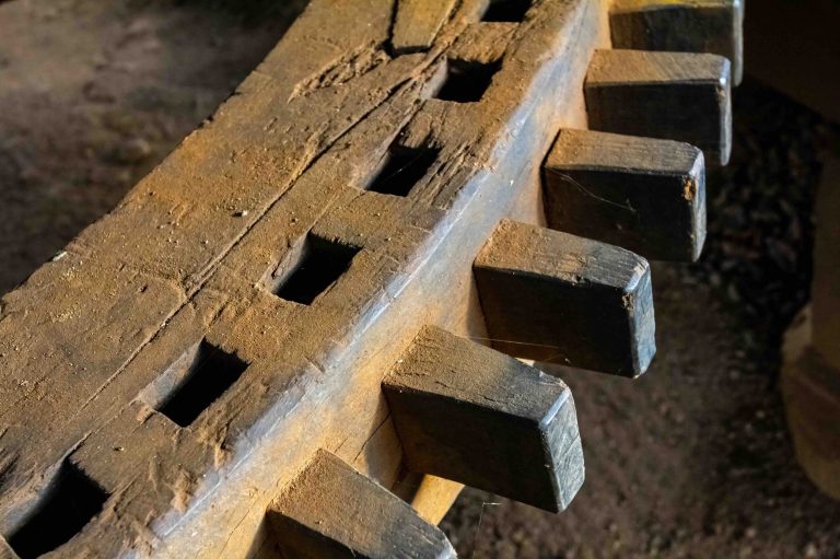 Aan de binnenzijde plaatsen we een inventief stelsel van tandwielen om de beweging van de molen over te brengen op de molensteen.